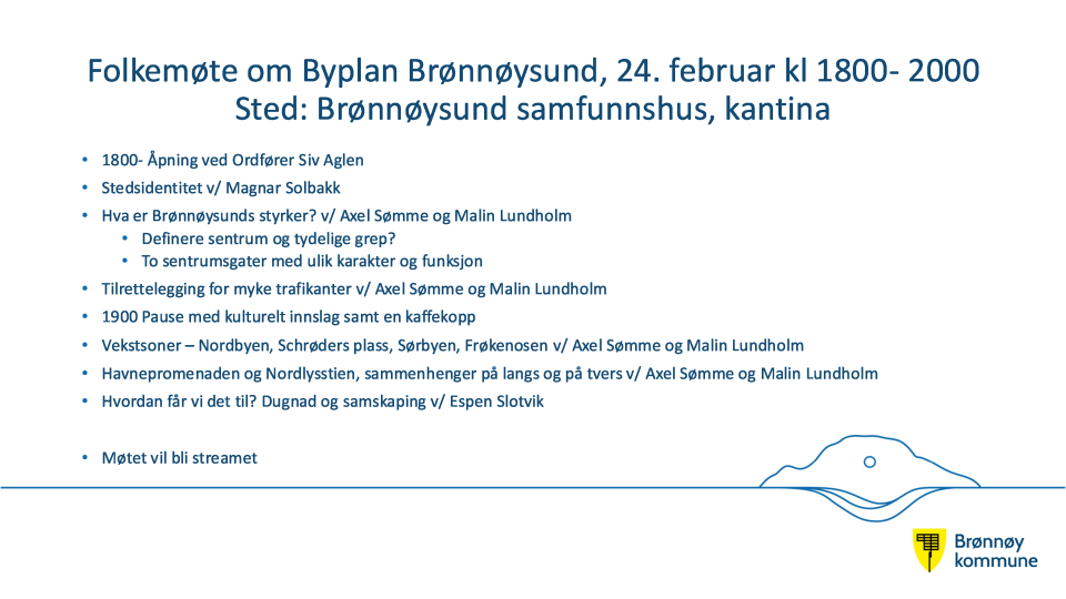 Folkemøte Byplan Brønnøysund den 24. februar fra kl. 1800 - 2000 Den 24. februar, fra kl. 1800 - 2000, arrangeres det folkemøte i kantina på Samfunnshuset i forbindelse med Byplan Brønnøysund. Alle er hjertelig velk...