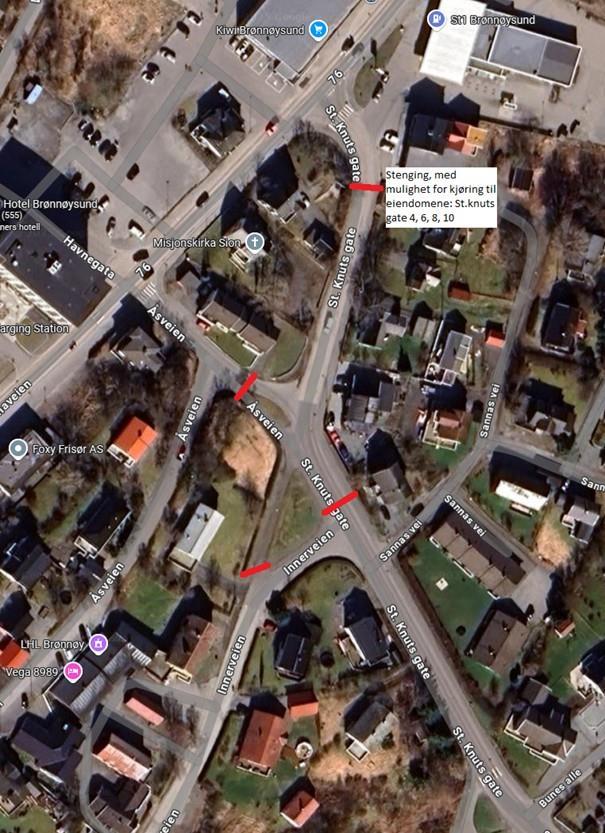 - Det vil fortsatt være mulighet for kjøring til eiendommene St. Knuts gate 4, 6, 8 og 10 som vist i kart.